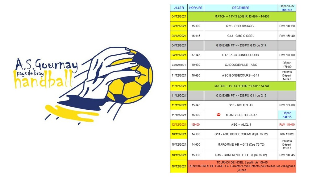 Le week-end du 11 et 12 décembre marquait la fin des premières phases de championnat pour les équipes jeunes. Au bilan, les G11, G13 et G15 terminent derniers de leurs phases respectives face à des équipes plus solides et parfois plus expérimentées mais il faut noter des progrès par rapport aux premiers matchs dans le jeu et le collectif pour ces trois équipes, la seconde phase de championnat devrait être plus intéressante. Les G17 terminent second de leur groupe et accèdent au championnat Excellence départementale, bravo à eux !